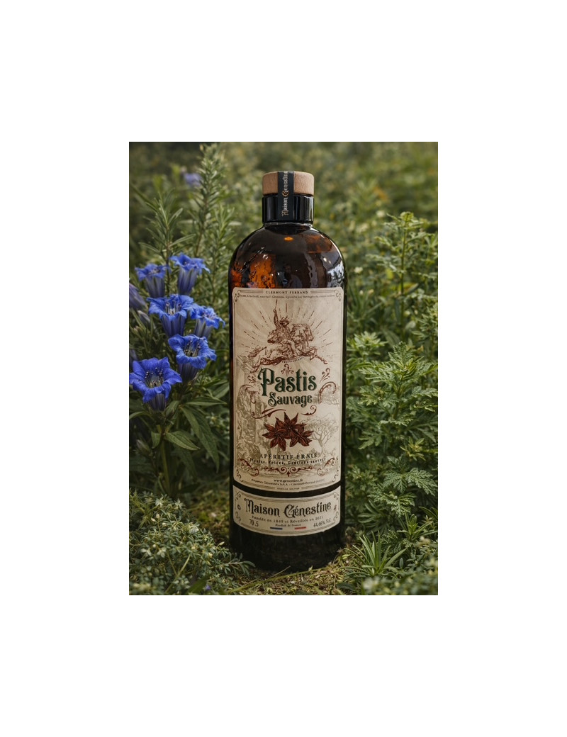 Composé d'une quinzaine de plantes aromatiques et d'épices soigneusement sélectionnées, le Pastis Sauvage de la maison Génestine est un pastis naturel et artisanal qui célèbre le savoir-faire français. L'anis s'y mêle à des notes herbacées et épicées, subtilement relevées par une pointe de gentiane qui lui apporte caractère et typicité.